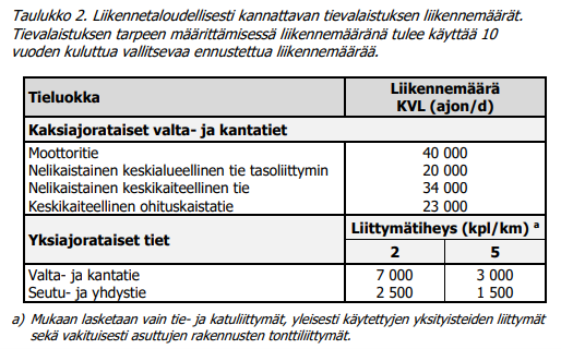 - keskimääräinen vuorokausiliikenne (KVL) on alle 40 % taulukon 2 arvosta
