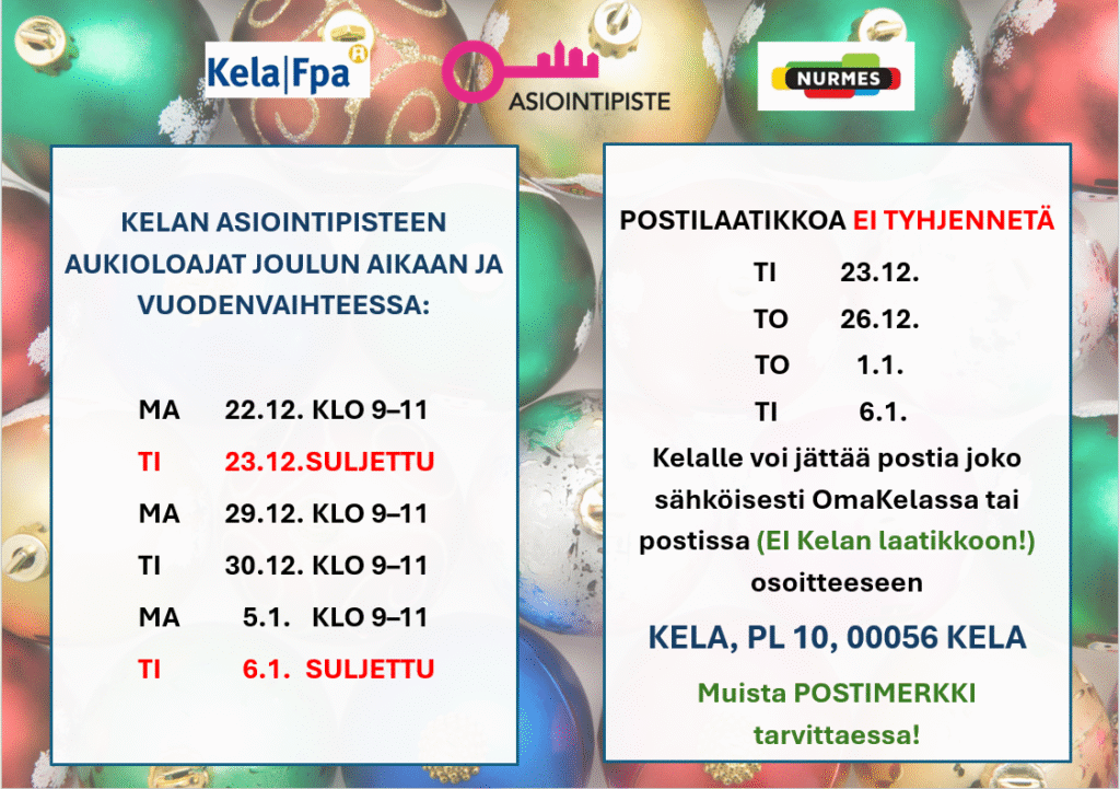 Kelan asioin­ti­pis­teen aukio­loa­jat jouluna ja vuoden­vaih­teessa