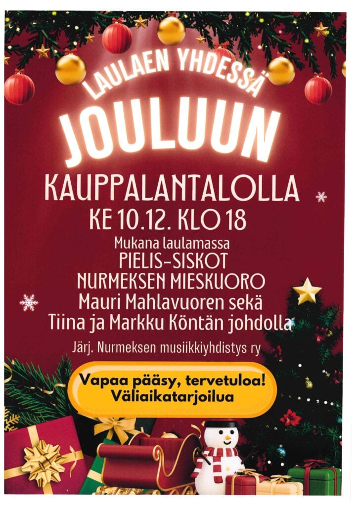 Laulaen yhdessä jouluun Kauppalantalolla ke 10.12. klo 18. Mukana laulamassa Pielis-Siskot, Nurmeksen Mieskuoro Mauri Mahlavuoren sekä Tiina ja Markku Köntän johdolla. Järj. Nurmeksen musiikkiyhdistys ry. Vapaa pääsy, tervetuloa! Väliaikatarjoilua!