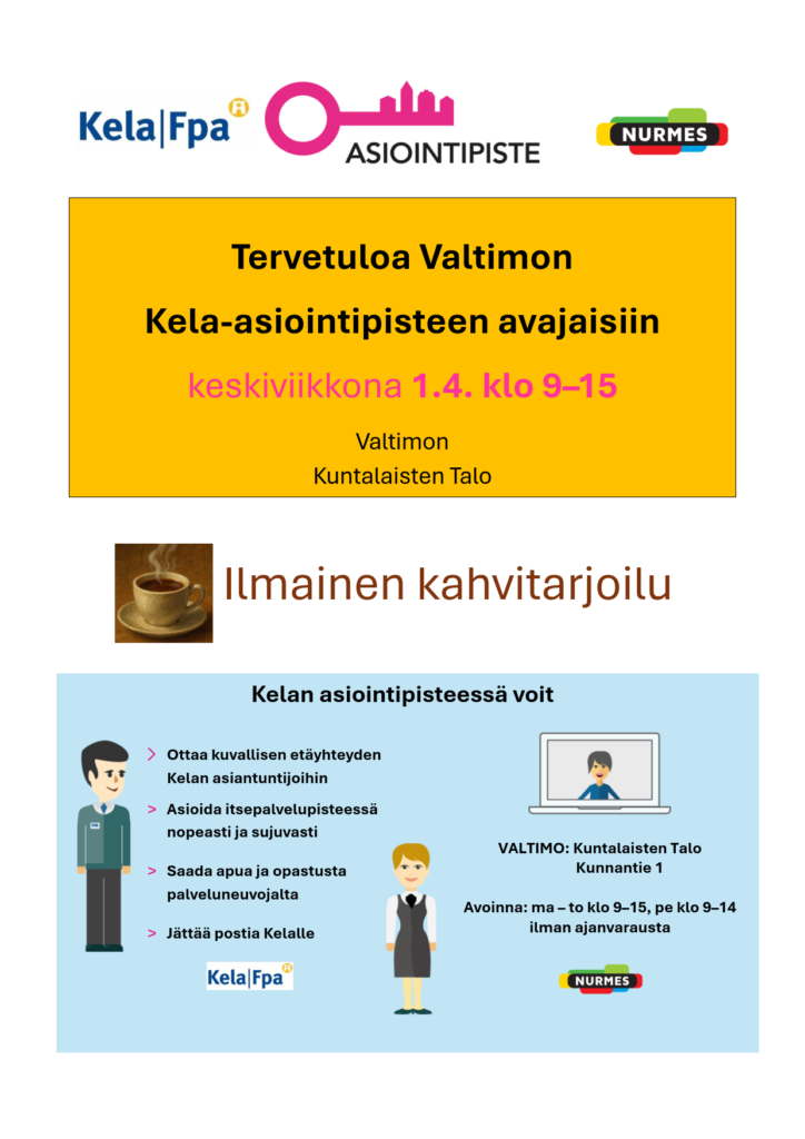 Tervetuloa Valtimon Kela-asiointipisteen avajaisiin Kuntalaisten Talolle (Kunnantie 1) keskiviikkona 1.4.2026! Paikalla on ilmainen kahvitarjoilu kello 9–15.
