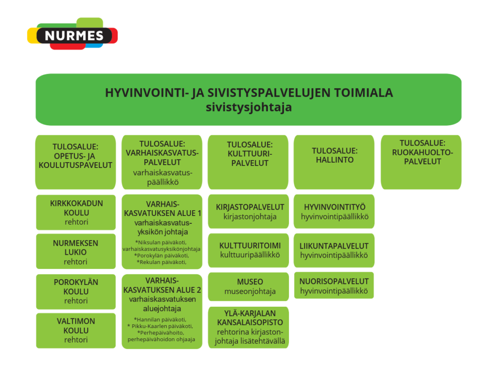 Hyvinvointi- ja sivistyspalvelujen toimiala vastaa hyvinvointi- ja sivistyspalvelujen kokonaisuudesta ja vaikuttamistoimielinten toiminnasta. Hyvinvointi- ja sivistyspalvelujen johtoryhmä yhteensovittaa hyvinvointi- ja sivistyspalvelujen toimialan toimintaa.