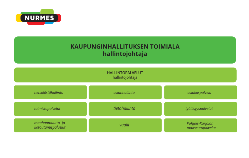 Nurmeksen palveluorganisaatio jakautuu hyvinvointi- ja sivistyspalvelujen ja elinvoimapalvelujen toimialaan. Elinvoimapalvelut muodostuvat kaupunginhallituksen ja kaupunkirakennepalvelujen toimialoista.